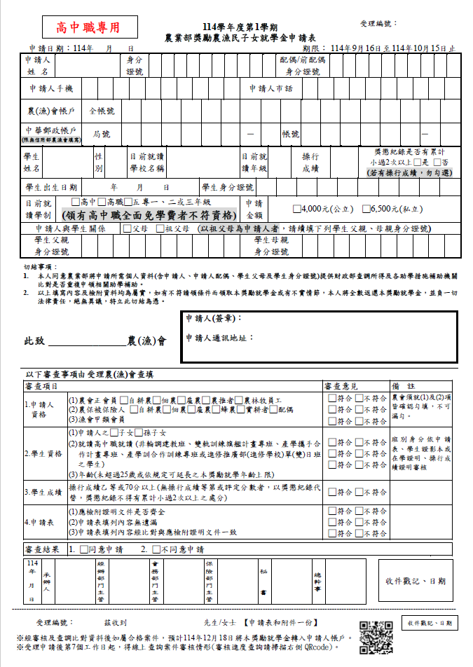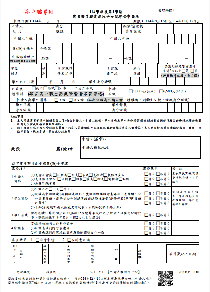 四、本學期申請表分為高中職及大專校院版,請農(漁)會依申請人需求提供,勿提供錯誤之申請表,另請申請人詳閱切結事項後,再予以簽章。