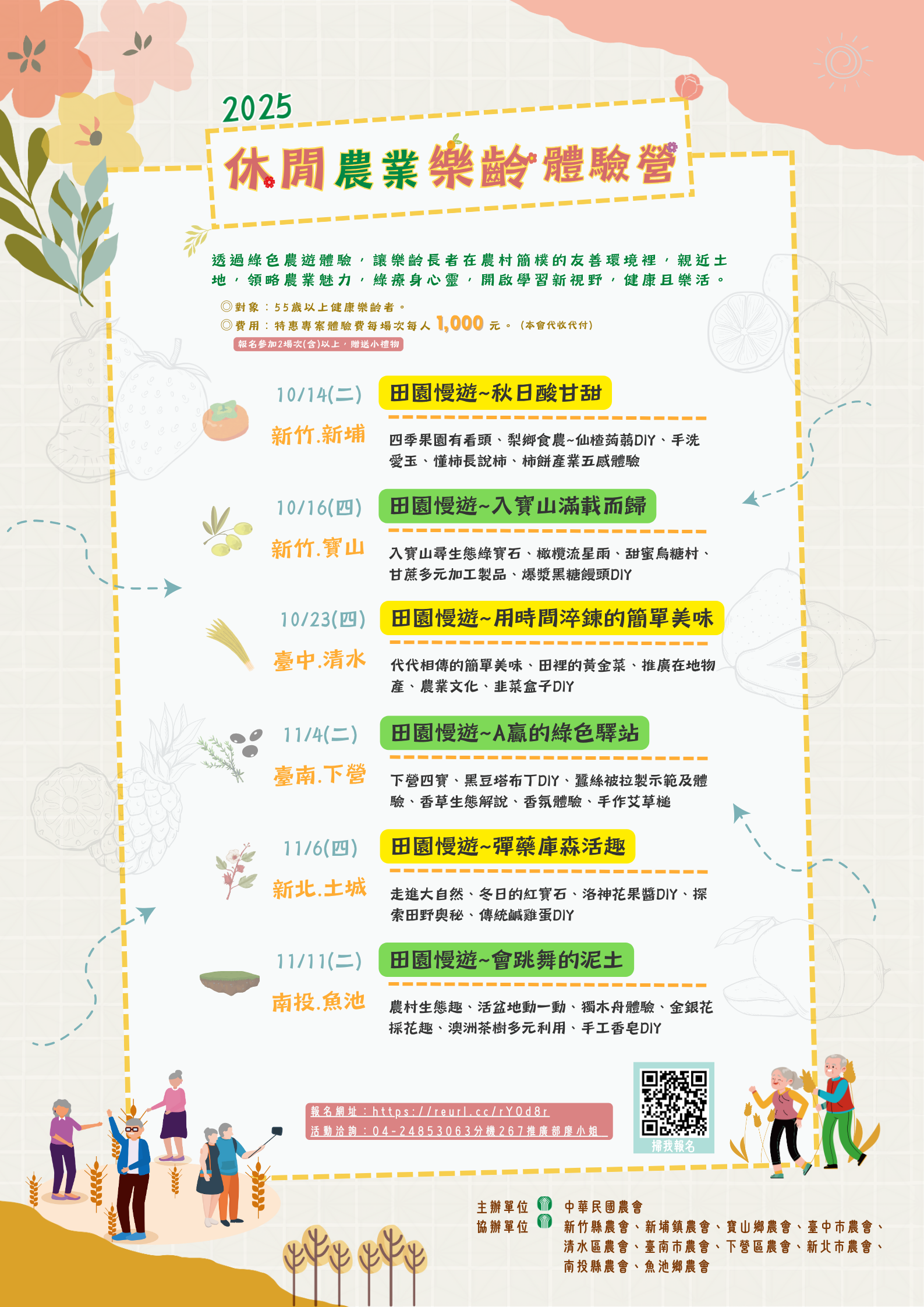 一、參加對象、人數及費用:55歲以上健康樂齡者,每場次以35人為限,中華民國農會代收部份負擔費用每人每場次1,000元,報名參加2場次(含)以上,贈送小禮物。