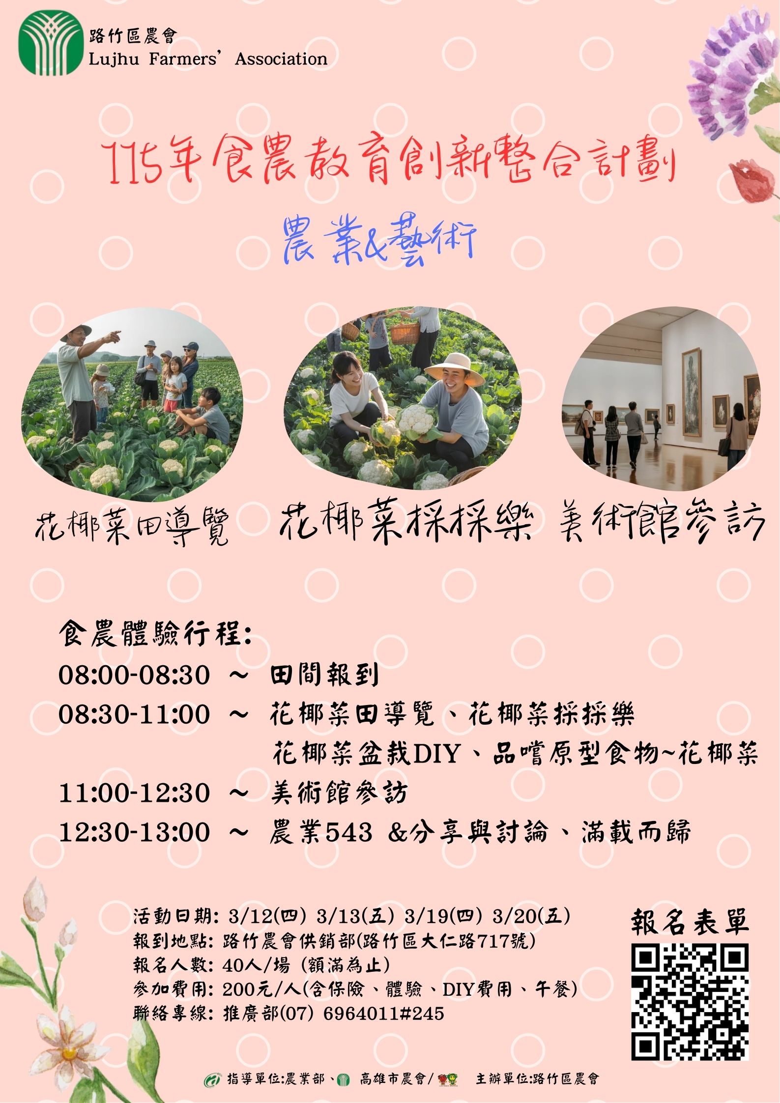 一、115年度食農教育創新整合計畫辦理。 二、活動日期: 115/3/12、3/13、3/19、3/20計四場次。 三、活動報名請點選https://www.beclass.com /rid=3052574698d2ff8eedac或掃DM上的QR碼填資料報 名。