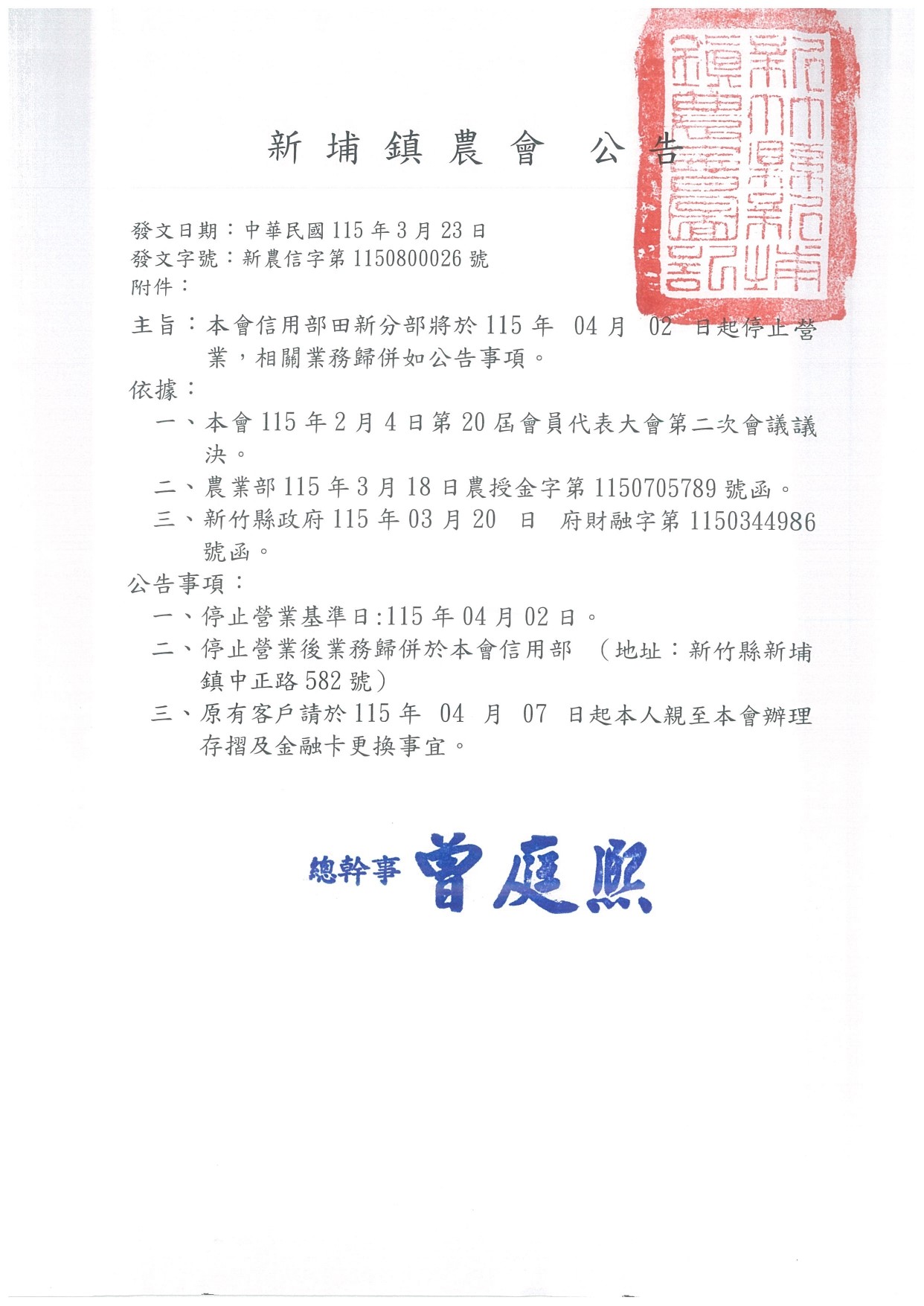 本會信用部田新分部將於115年04月02日起停止營業,相關業務歸併如公告事項。