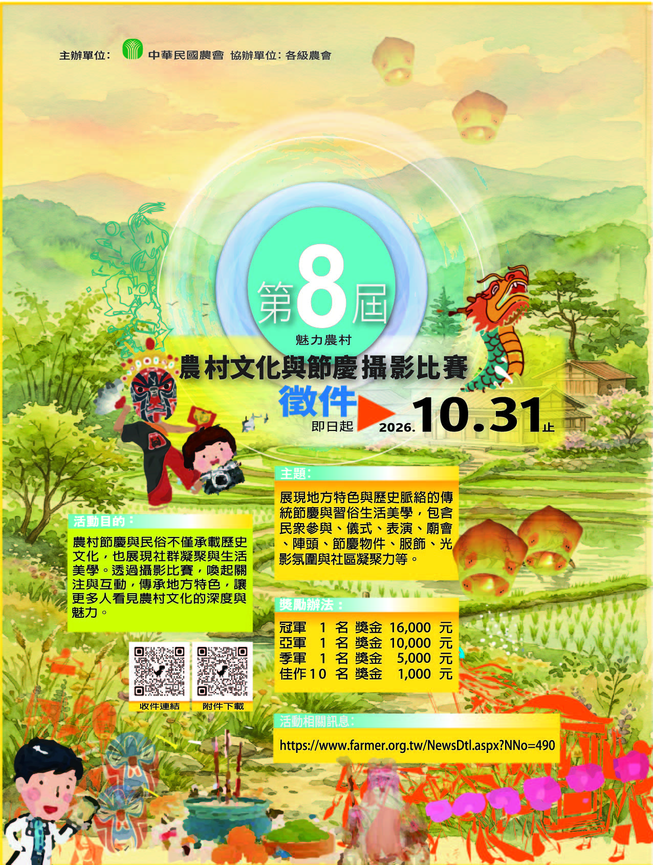 主旨:中華民國辦理第八屆魅力農村-「農村文化與節慶」攝影比賽辦法,請踴躍報名參加。